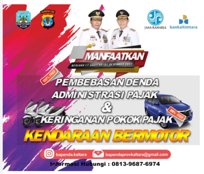 TANJUNG SELOR, teropongborneo.my.id – Dalam rangka menyambut semarak HUT RI ke 76, Pemerintah Provinsi (Pemprov) Kalimantan Utara (Kaltara) akan melakukan relaksasi Pembebasan Denda Administrasi Pajak dan Keringanan Pokok Pajak Kendaraan Bermotor.