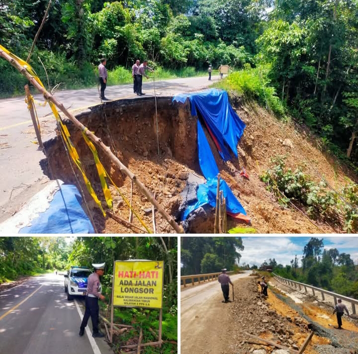 Dalam giat tersebut, personel melakukan koordinasi dengan pihak BBPJN Kaltim (Balai Besar Pelaksanaan Jalan Nasional Kalimantan Timur) untuk percepatan perbaikan dan perawatan badan jalan yang terdampak. Selain itu, petugas juga memasang rambu imbauan serta pita pengaman (pita safety) di lokasi rawan sebagai peringatan dini bagi pengendara.